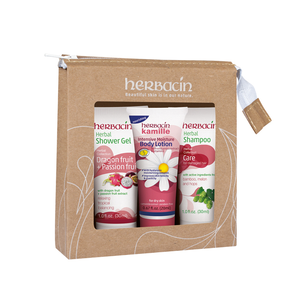 This Pamper Yourself Trio of mini tubes includes a selection of must-have products to cleanse and care for your skin and hair. Each product is dermatologically tested and vegan, with no parabens, mineral oils or synthetic colors. The set includes Herbal Shower Gel in dragon fruit and passion fruit, as well as the Herbal Shampoo Care and Herbacin Intensive Body Lotion.