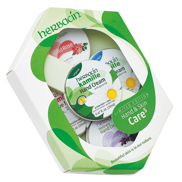 This Hand & Skin Care 5 Tin Set of trial-size containers is perfect for on-the-go skin protection. Each tin provides hands and skin with natural all-round protection free from parabens, mineral oil, animal byproducts or synthetic colors with Herbacin Hand Cream in original, unscented and intensive moisture formulas, and Wellness Hand Cream in wild rose and lavender.